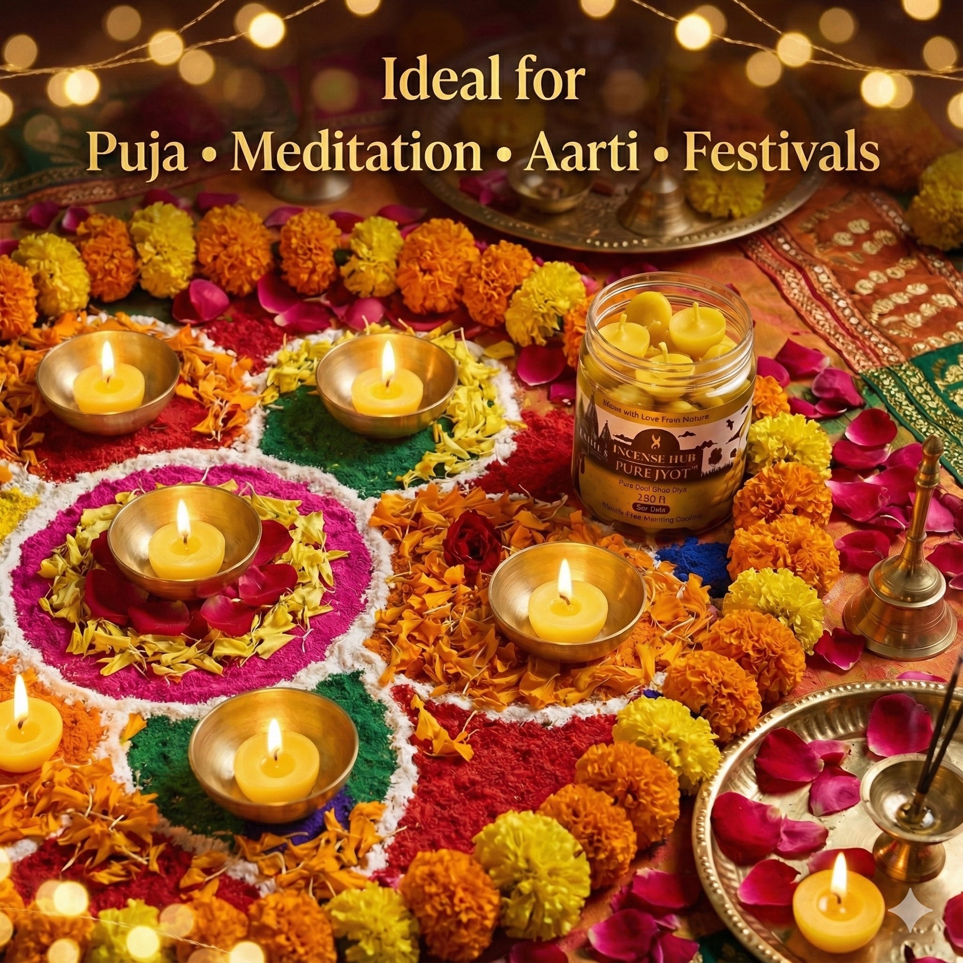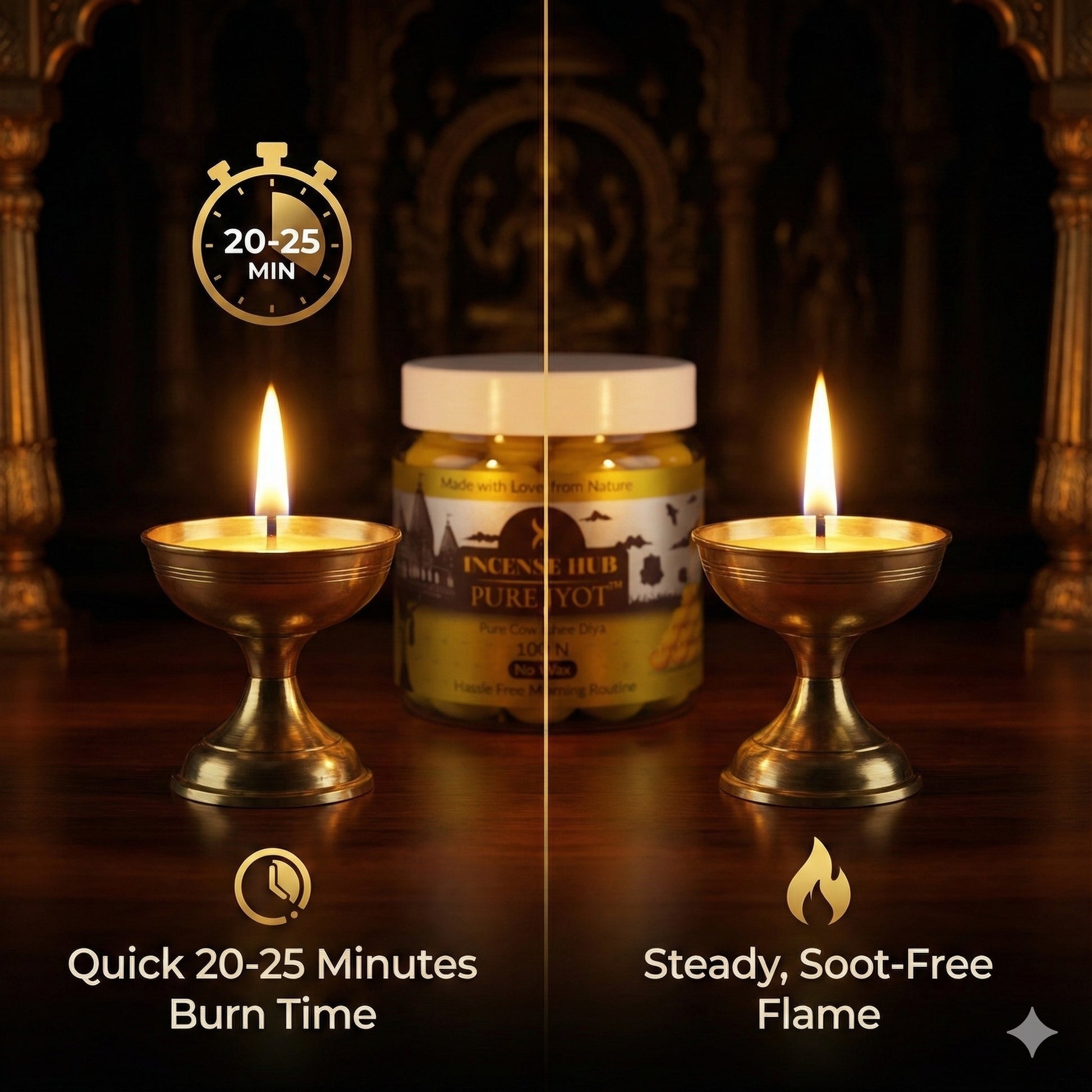 Designed for today’s fast-paced lifestyle, PureJyot diyas offer a steady 60–90 minute burn time, releasing a natural ghee aroma that enhances positivity, purifies the environment and elevates spiritual ambience. Whether you are performing a simple home puja or preparing your mandir for a festival, these ready-to-use diyas save time while preserving the tradition of lighting pure ghee Jyot every day.