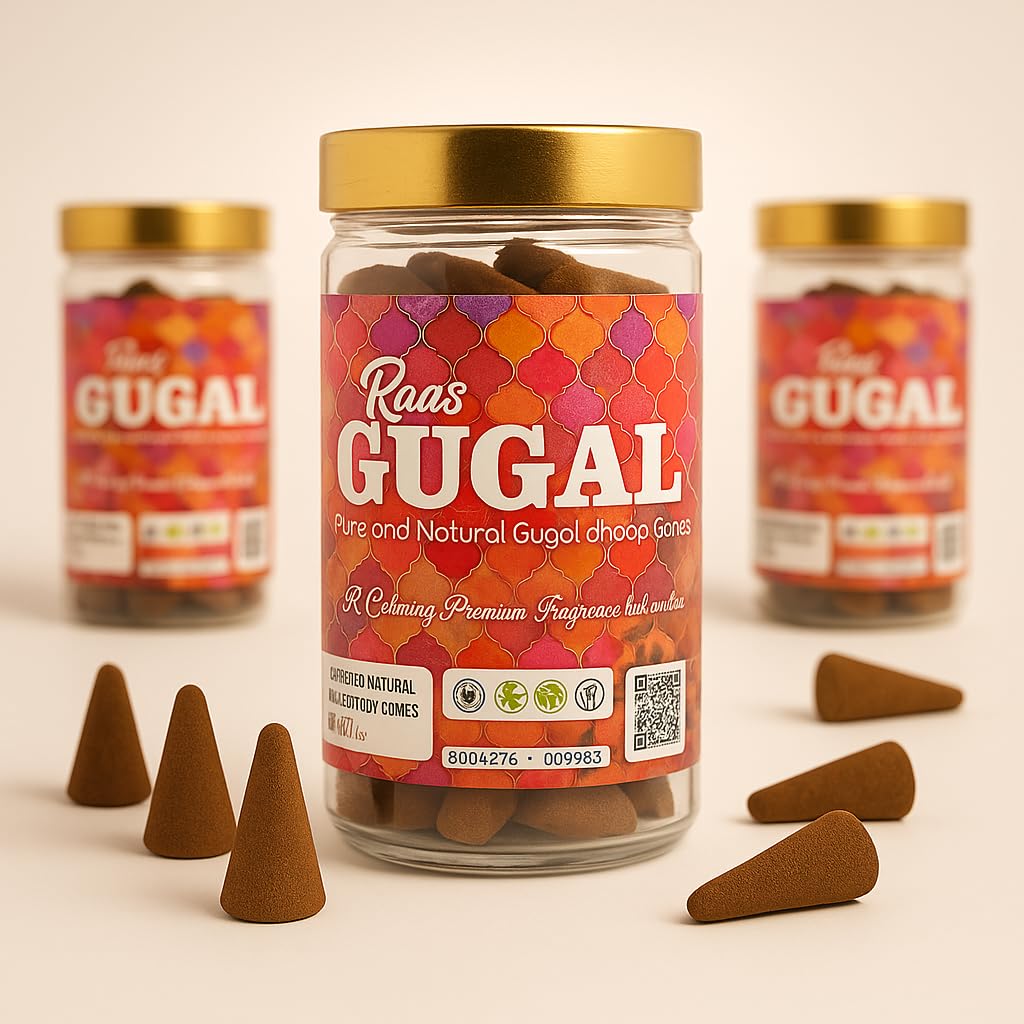 Experience the spiritual and purifying fragrance of Raas Gugal with these premium Gugal Dhoop Cones. Made from pure gugal resin, this sacred aroma has been used in temples, havans, and meditation for centuries to cleanse the air, remove negativity, and create a divine ambiance.