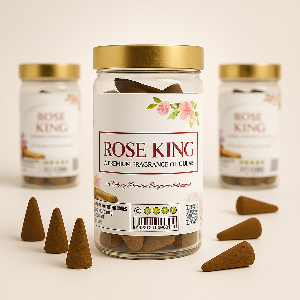 Experience the majestic aroma of Rose King Dhoop Cones, crafted from premium rose extracts to bring the rich, velvety essence of blooming roses into your space. This royal floral fragrance is perfect for pooja, meditation, and relaxation, creating an atmosphere of love, devotion, and tranquility.